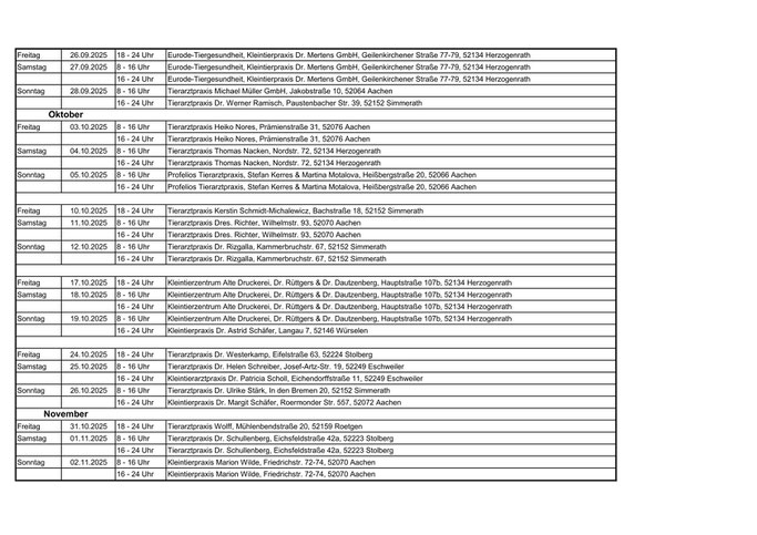 Absofort können Sie über die Zentrale Notdienstrufnummer für die StädteRegion Aachen den diensthabenden Tierarzt erfragen.